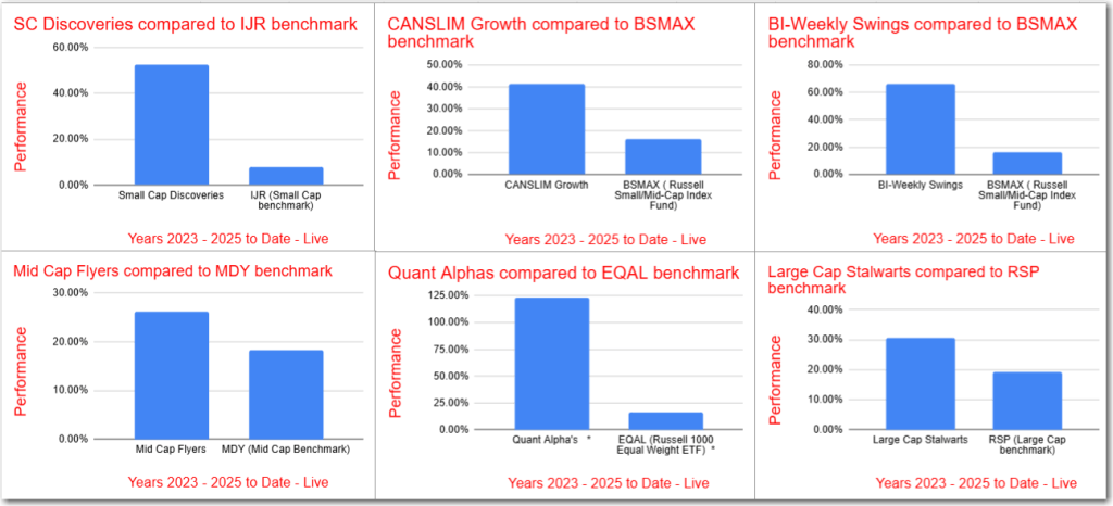 The Quant Alpha’s is now up over 122% for 2023-2025 and continues to destroy its benchmark EQAL by 106%. Noteable outperformers WGS +301%, POWL +249%, APP +877% and CLS +272%