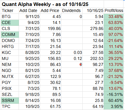 The Quant Alpha Weekly Portfolio continues it’s steady increase in new members and remains substantially ahead of its benchmark. Up over 35% since it began on June 27. 2025.