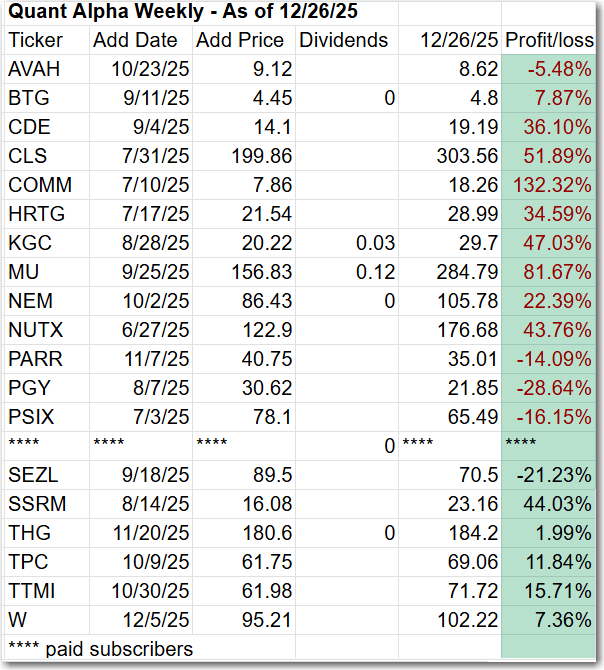 The Quant Alpha Weekly Portfolio remains ahead of its benchmark. Up over 28% since it began on June 27, 2025.