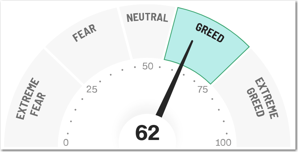 - The CNN Fear & Greed Index remained in the Greed zone (around ~62/100) during this period, indicating bullish sentiment among investors despite the week’s mild pullback.