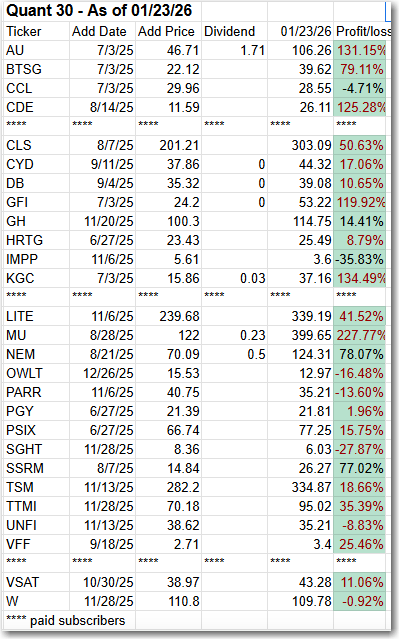 The Quant 30 Portfolio remains ahead of its benchmark. With new earnings reports coming out, the pace of turnover is increasing. It is up 32% since it began on June 27, 2025.