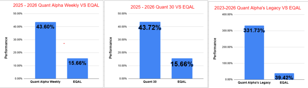 The Quant 30 and Quant Weekly Model Portfolios had large gains for the second week in a row. Quant Weekly went from +33% on 4/6/26 to +43% now. Quant 30 went from +32% to +43% now. Two weeks ago Quant Weekly was at 23% and Quant 30 at 22%. This is an increase of 20% over two weeks. Quant 30 and Quant Alpha’s Legacy Portfolios make all time highs.