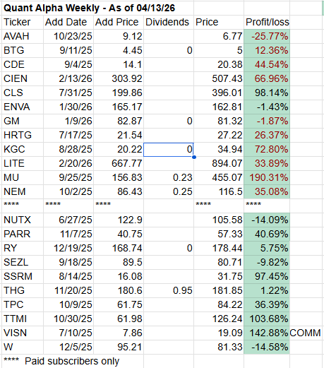 Note: You are enjoying the free subscriber newsletter. Paid subscribers enjoy instant access to weekly Model Portfolio updates upon release and a Top Quant Stocks list. Free subscribers get access to Portfolio updates after a three-week delay but no Top Quant Stocks list. Want timely access to the new Adds/Removes and Top Quant Stocks list? Subscribe at $20 a month or $119 a year.