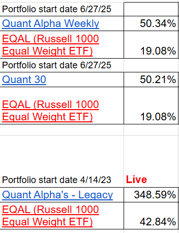 The Quant 30 and Quant Weekly Model Portfolios had a great week with all three Portfolios making all time highs! The Quant Weekly and Quant 30 are now up 50% from the 6/27/26 start date and Quant Legacy up 348% from the April 2023 start date. All three Portfolios are packed with quality momentum stocks and when the market enters a risk-on phase, these stocks lead the way up.